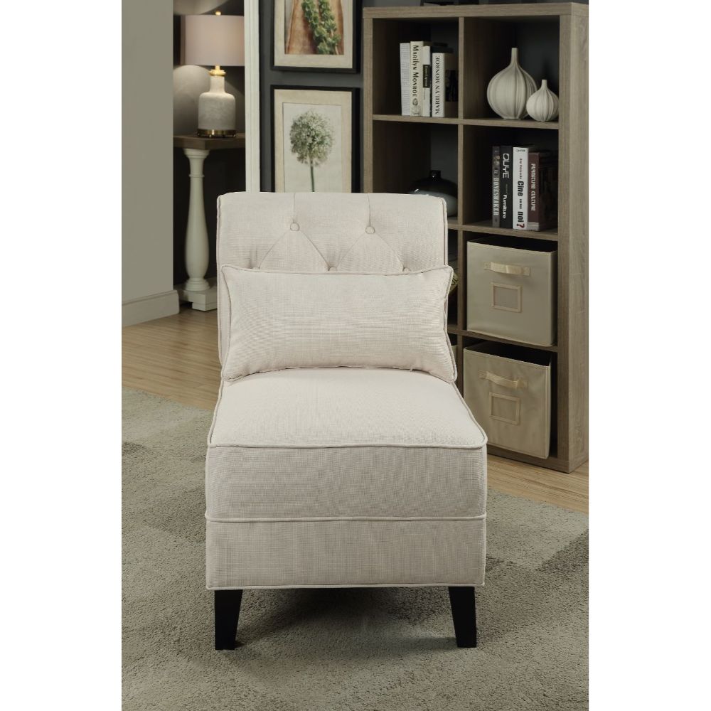 The Susanna armless slipper chair with accent pillow features contemporary style, padded back and seat cushion, button tufted backrest, covered with selected fabric, and its complemented by tapered wooden legs. Create elegant and sleek contemporary style that is perfectly suited for any living room environment.