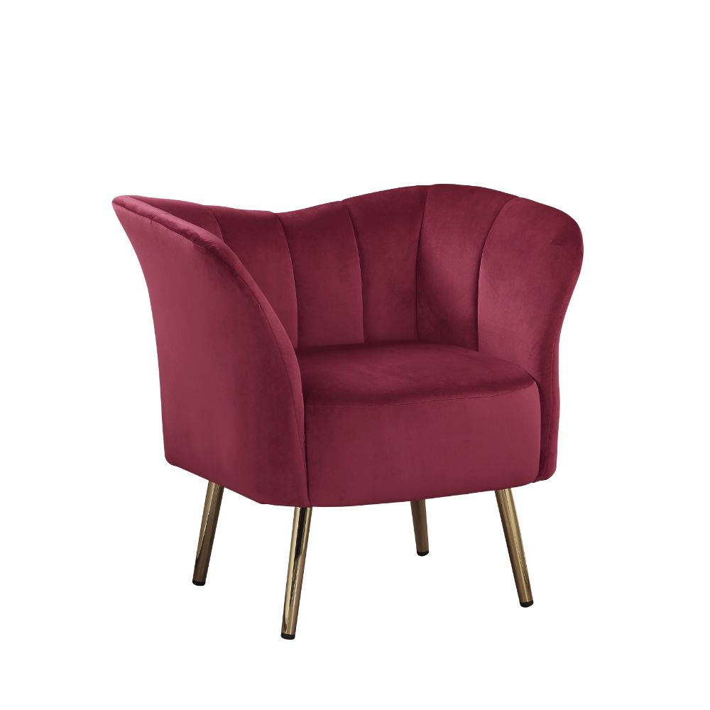 With its transitional design, the Reese accent chair is sure to please. Whether you're going for a classic traditional style or a more modern look, its versatile design ensures that it can fit within various aesthetic styles. It features a barrel backrest with channel tufting. Its beautiful gold metal spindle legs and velvet upholstery adds a flair of elegance and sophistication. Available in two colors, burgundy and gray velvet.