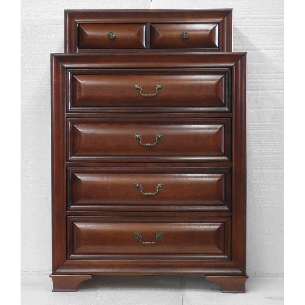 The Konane chest comes in rich brown cherry. Features unique style like bottle shape, it is separated into 2 layers 8 drawers. The top layer occupies 2 drawers with antique brush hardware knobs while the bottom long drawers are accented under the below with antique brush handle. All drawers have English dovetail with center metal glides.