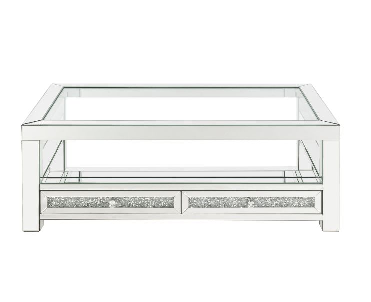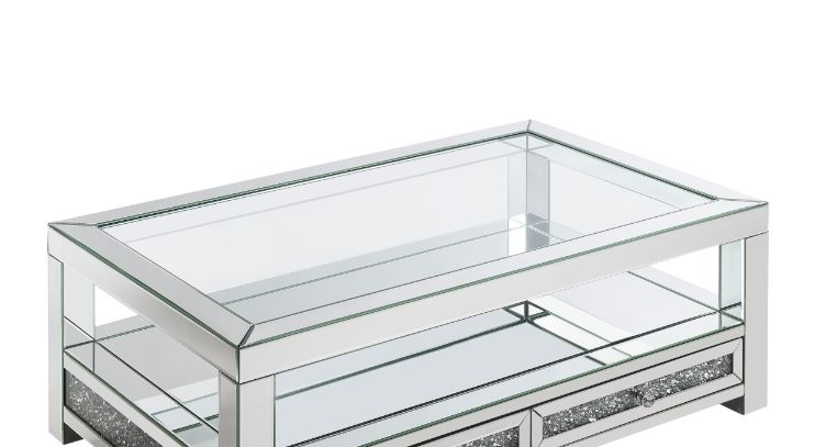 The Noralie Coffee Table will add a contemporary touch to any room in your home. With its clean lines, this brilliant rectangular occasional table showcases a distinctive style for an intriguing look. The table features a clear glass top with faux diamond inlay. The clear glass top allows light to flow right through to the bottom shelf. There are two storage drawers that provide ample and convenient storage for make-up brushes, jewelry, and more.