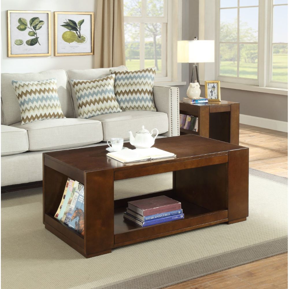 The Pisanio coffee table is an instant transformation in your sitting area to get that rustic inspired look. The rectangular espresso finish table features a bottom shelf and side magazine holders and Wooden Base with Straight Panels.