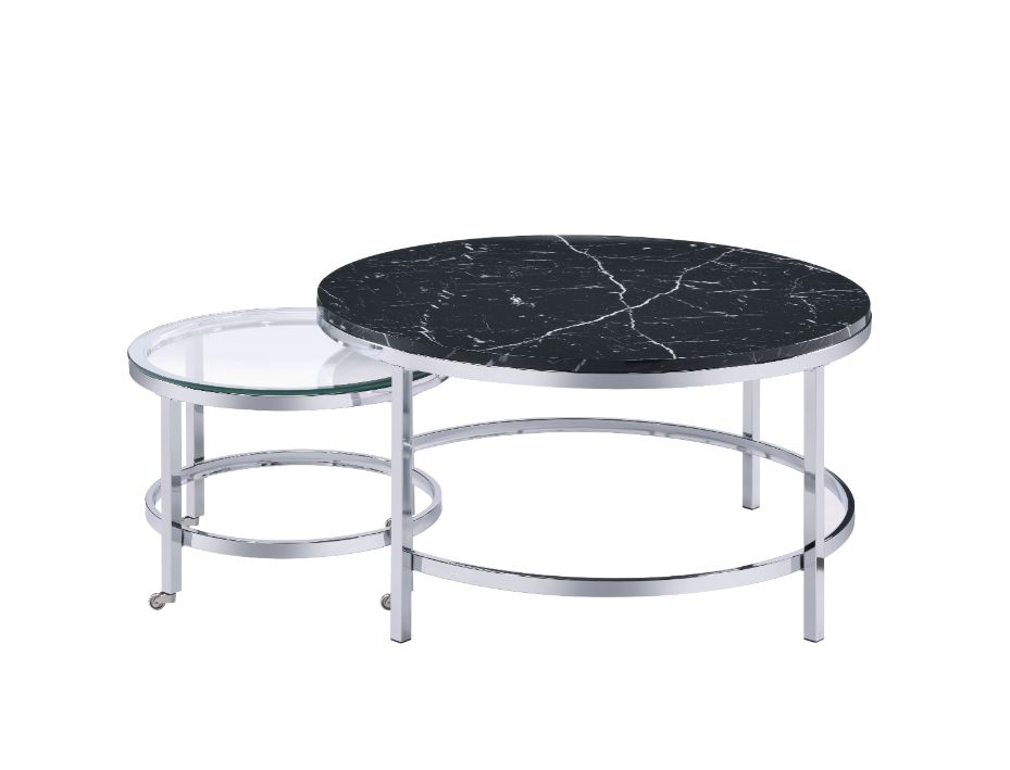 Infuse your small space with big style. The nesting cocktail table combines modern flair with functional design. Including two table in two different materials and sizes, the nesting table set is incredibly flexible in its unique stacking capabilities perfect for small living spaces. Smaller table includes glass shelf and caster wheels for storage and easy mobility. The Virlana Nesting Table will make your sitting area shine and reflect your sense of style.