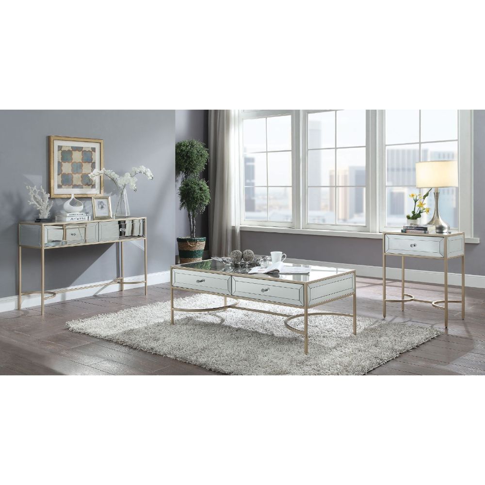 Assambled, Rectangular Leg Coffee Table Storage: 2 Drawers (Open Base) CONSTRUCTION Mirrored Top Drawer: 3mm & 4mm Mirror w/MDF, Top Size: 7 Inches Height Metal Straight Leg, Frame & Curved Crossbar Supports: Rose Gold Finish, Square Metal Tube 16mm, Base Size: 11 Inches Height Drawer: GLIDE Side Metal (2/3 Ext.), Felt Lined NOT Included (Fully Black Finished Inside), Safety Stop Included, Manual Close, Hardware: Single Crystal like Knob, Drawer Internal Size: 21" x 15" x 3"H