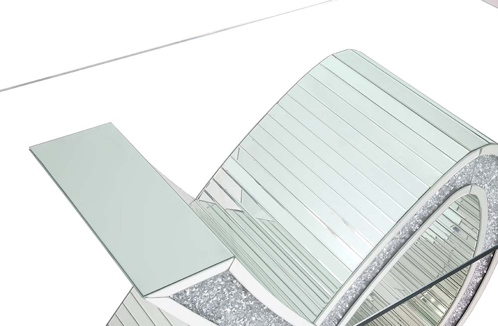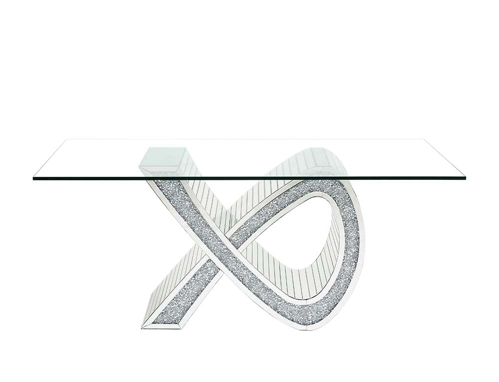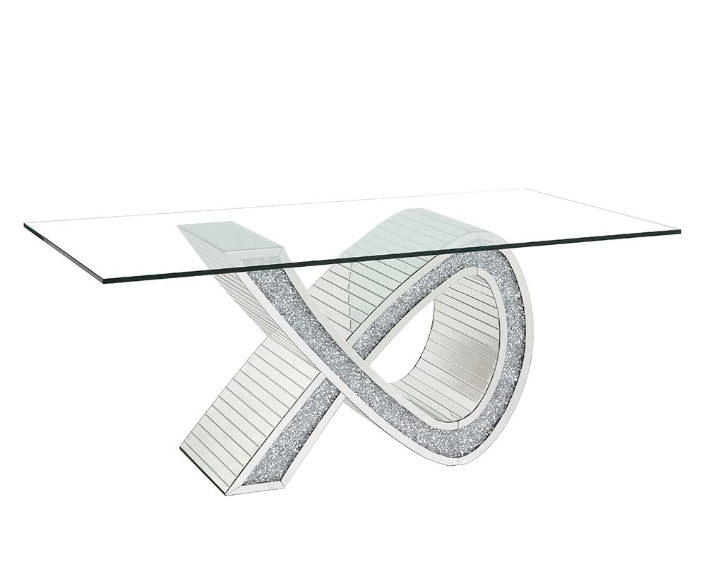 Gather friends and family around the Noralie mirrored and faux diamonds dining table. Ideal for various types of gatherings. The ribbon-shaped base makes for an eye-catching piece that will leave guests impressed. The sturdy and spacious tempered glass tabletop has room for all your dining necessities. The chairs are beautifully scalloped and are accentuated with a shiny chrome frame. The padded seats offer plenty of support and comfort. Available in beige and black