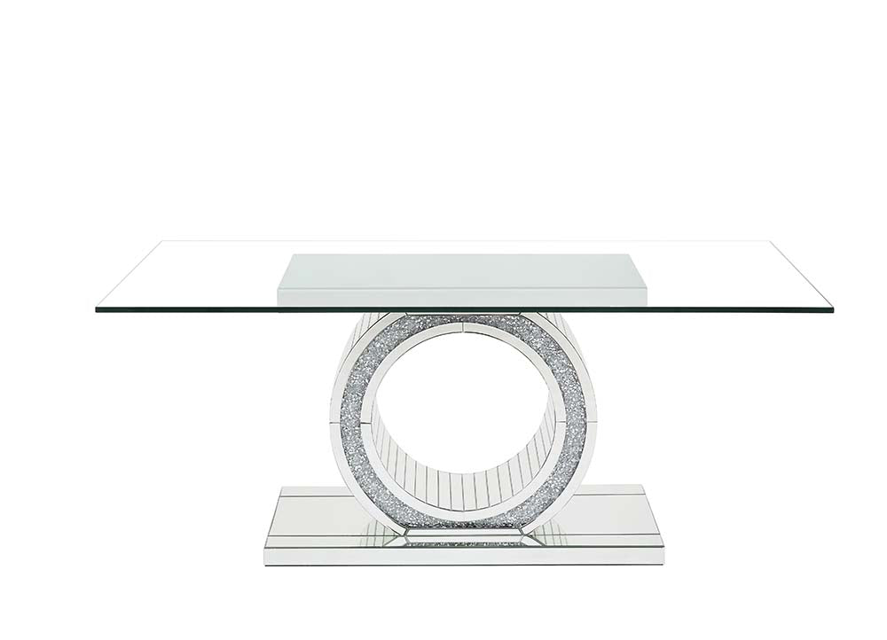 The crystal-clear tempered glass tabletop is perched on top of a glimmering base of this glamourous Noralie dining table. The open circle design makes the piece appear airy while the mirrors and faux diamonds reflect light throughout your dining area. With enough room to host all your friends and family. The matching chairs have a shiny chrome base, the padded seat and backrest are upholstered in a pearlized faux crocodile fabric.