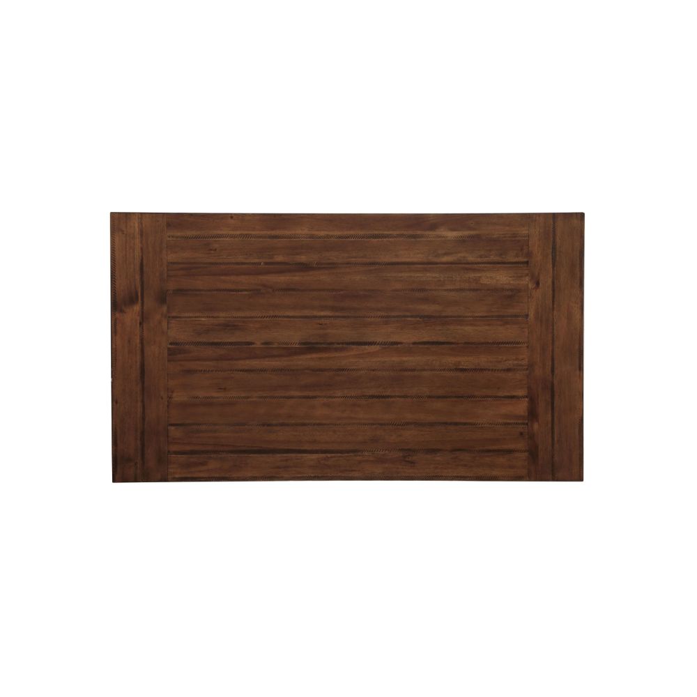 Farmhouse living is characterized by clean simple lines. Appealing as it evokes nostalgia for earlier times. Today's farmhouse designs can be traditional, casual or even modern in style. Finished in a walnut with rub through. The horizontal planked top, solid turned legs, and four storage drawers with pewter cup pull, on both side of the table, are perfect for storing napkins, extra placemats, or other dining essentials