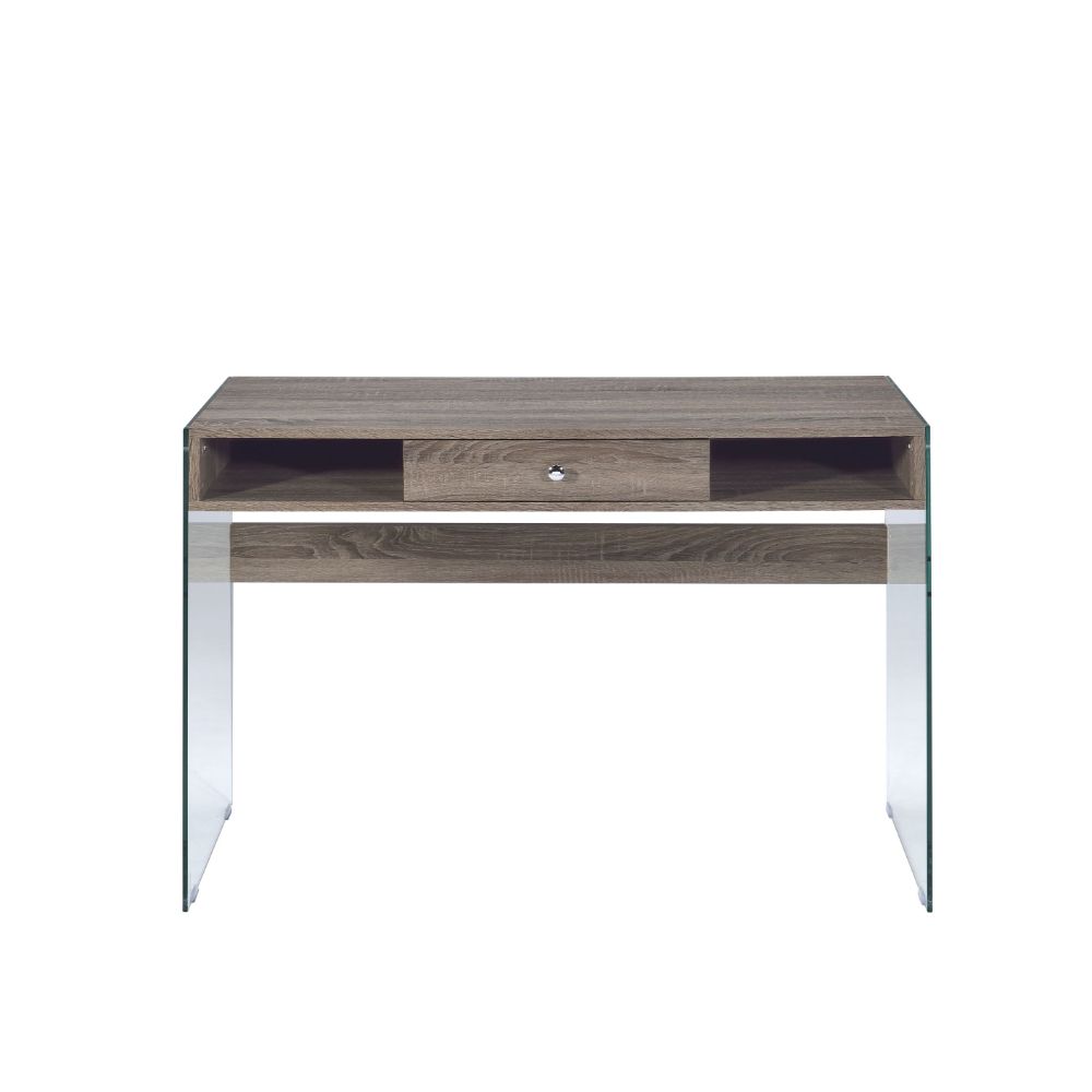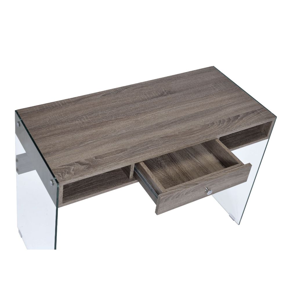 KD, Rectangular Writing Desk Storage: 1 Drw & 2 Compartments Wooden Top & Drw: Gray Oak, Weathered Finish, PVC Veneer, MDF 15mm, 25mm Glass Stand: 8mm Clear Tempered Glass Drawer: GLIDE Side Metal (1/2 Ext), No DT, No Felt-Lined, Knob: