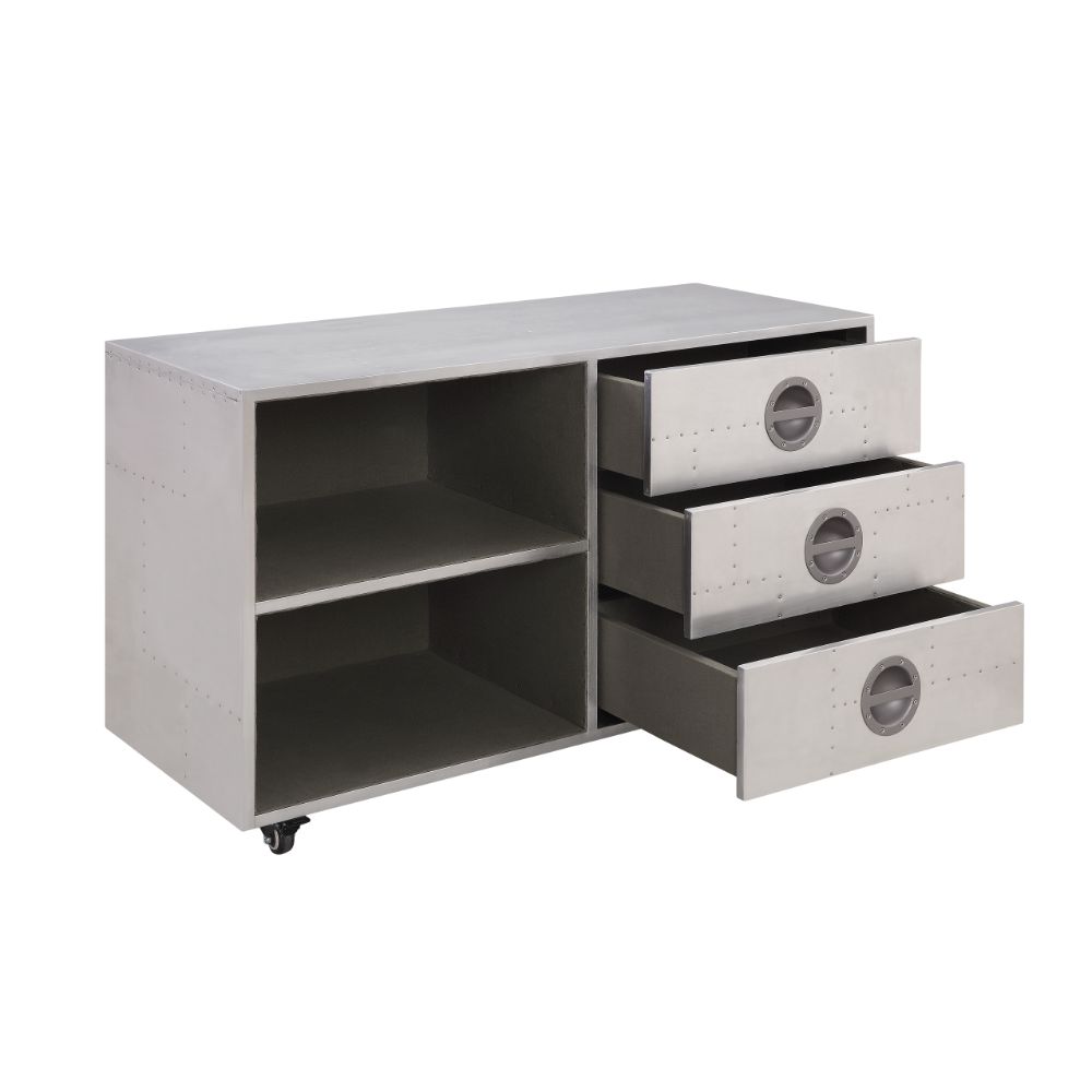 Switch up your style in the study with the clean-lined Brancaster desk, a perfect addition for achieving an industrial look. Whether you re working from home or simply scrawling a quick to do list, having a spirited space to get things done always makes any task more fun. This beautiful desk features a stunning patchwork aluminum top and sturdy iron legs. Matching case pieces for this modern masterpiece include a storage cabinet with one shelf and three drawers. Offering a blank canvas for all your desktop ideas, this piece is perfect for any room d cor.