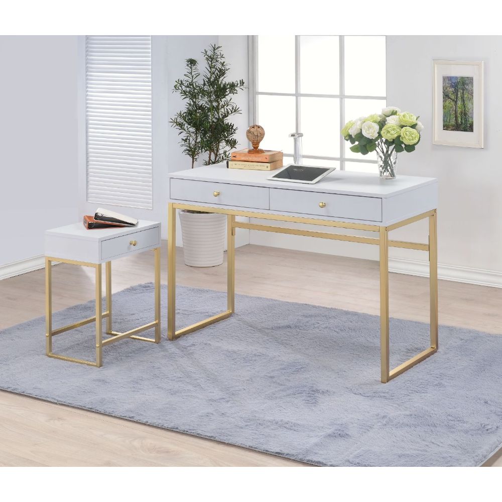 The Coleen desk offers an sleek and contemporary design. This compact workstation is crafted in selected white veneers with contrasting brass finish legs. The storage feature includes two top drawers to keep your office supplies. Stylish sleek design and practicality go hand-in-hand with this desk.