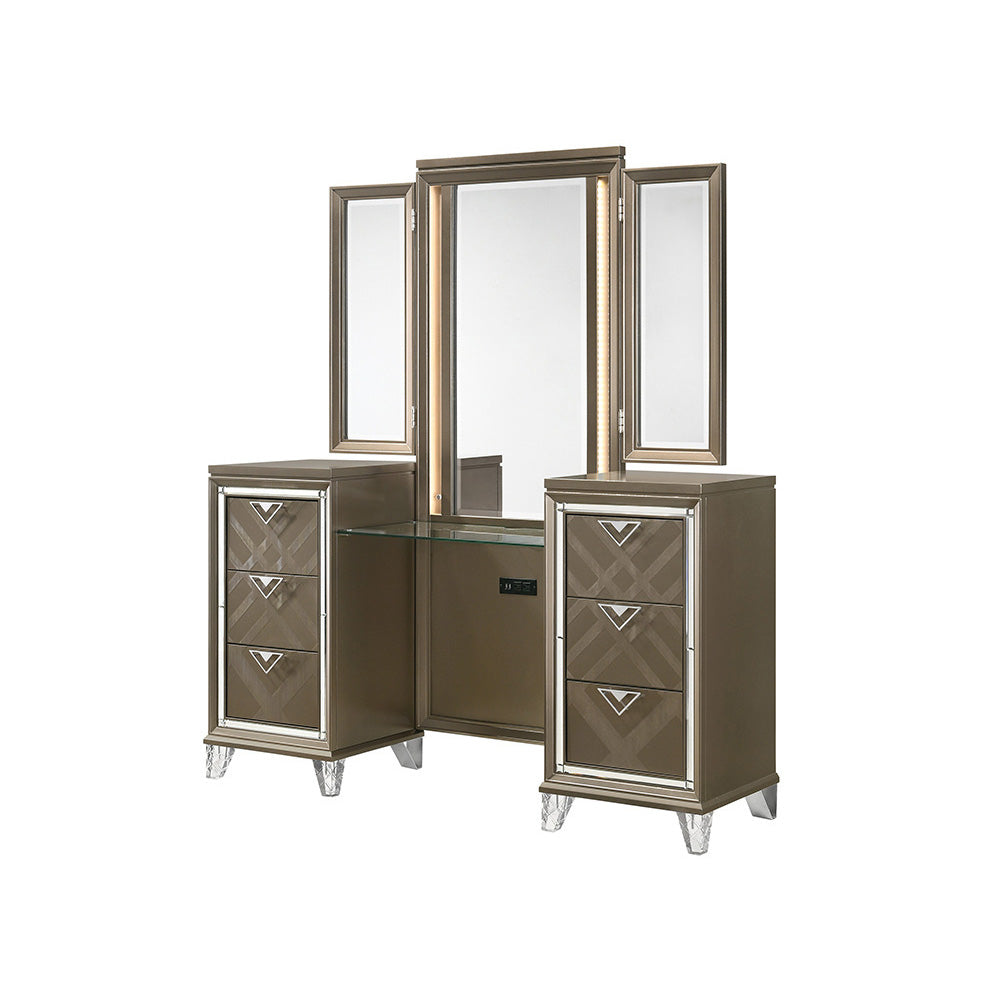 Vanity Set: Rectangular Vanity Table, Tri-Fold Mirror Storage: 6 Drawers () Vanity w/USB Power Dock, Glass Top, Tri-Fold Mirror w/LED Touch Light & Back Panel w/Hidden Jewelry Rack CONSTRUCTION] Drawer: Embossed Fronts, GLIDE) Side Metal (2/3 Ext.), DOVETAIL) English Front & Back, Lined Paper Veneer (NO FELT), Safety Stop, Manual-Close, Hardware: Single Pull Metal Knob CONSTRUCTION] Wooden Case-Leg: Wood (Rbw), MDF, PB Acrylic Tapered Leg