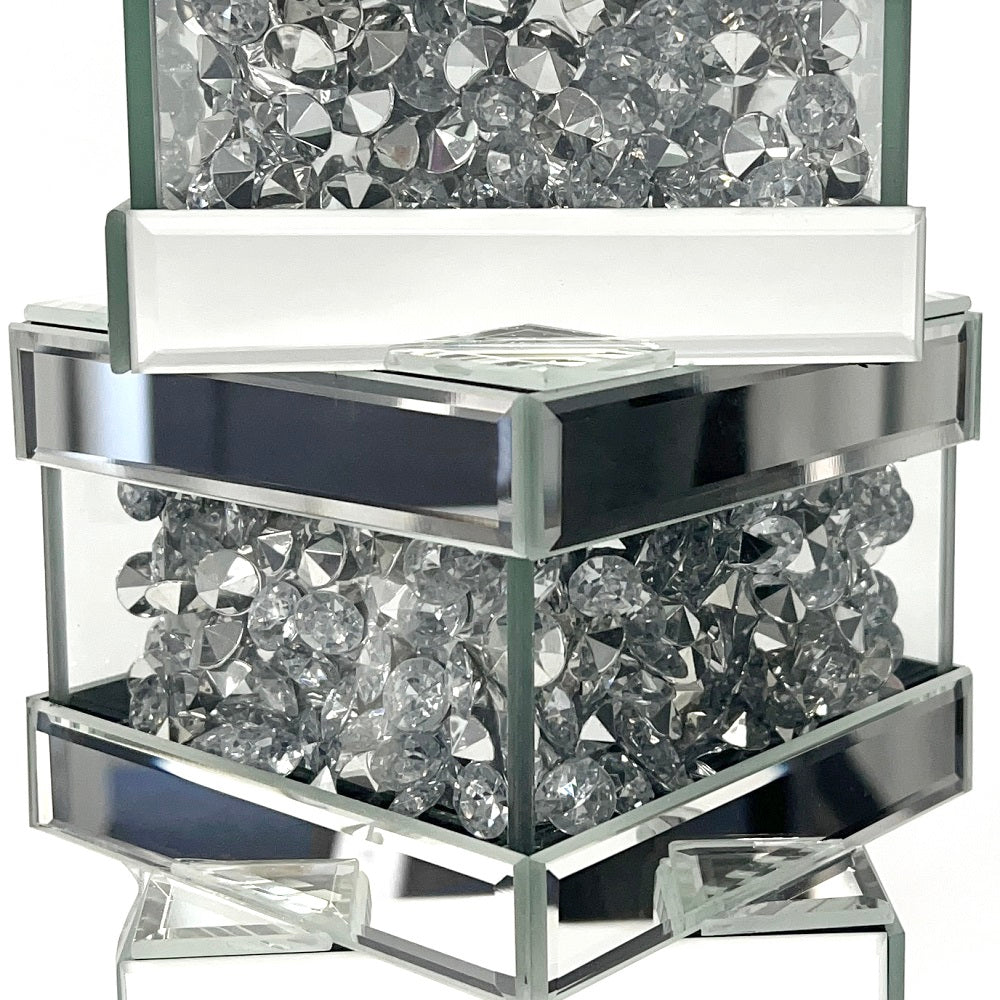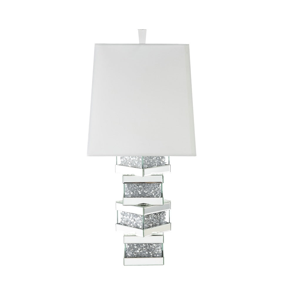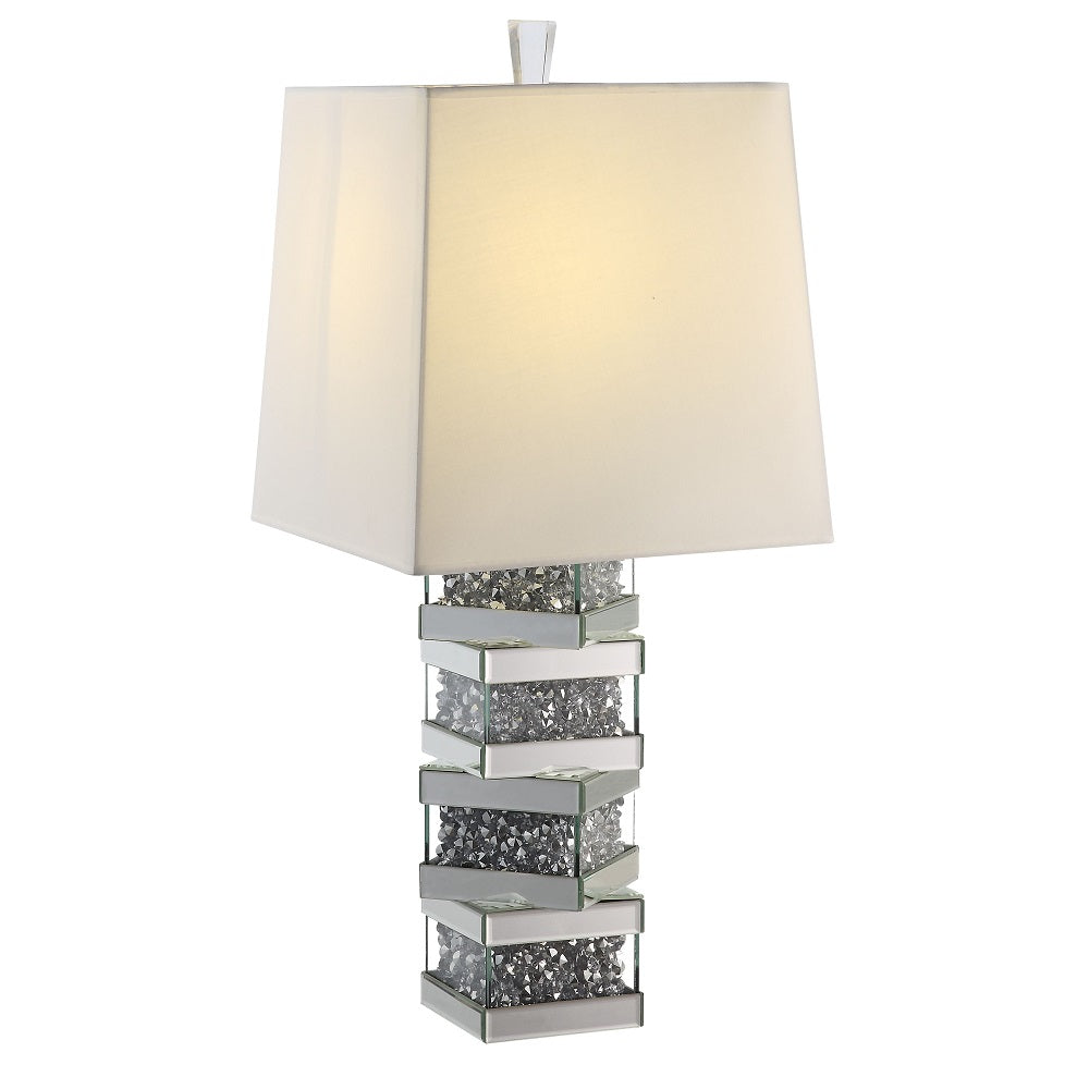 Brighten up your room in sophistication style with this Noralie Table Lamp. Fitting in a variety of design aesthetic, this piece features a classic drum shaped shade. The table lamp showcases a cuboid mirrored base with clear glass and faux diamonds inlayed, as attractive as it is sleek. this piece is a must-have for getting ready in living room or bedroom. Add both light and shine to your room decor with the Noralie Table Lamp.