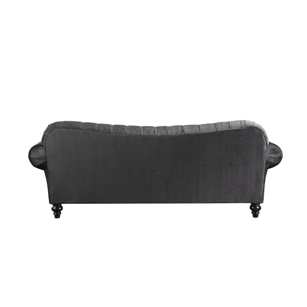 KD Leg, w/4 Pillows Features: Button Tufted (Back, Seat & Arms), Nailhead Trim (Arms & Base), (Down Feather Fill Pillows Only) Tight Back & Seat Cushion (1+1) CONSTRUCTION SEAT: Full Foam Fill, Inside Frame: Solid Wood BACKREST: Arched, Button Tufted (Inside Only) ARMREST: Rolled & Nailhead Trim (front) Wooden Bun-Turned Leg: Black Finish, Leg Size: 6 Inches Height Material: Dark Gray Velvet (Solid Pattern) Pillows: Contrast Pattern, Removable Cover (Duck Feather Filling), Pillow Size: 22" x 22", 19" x 19"