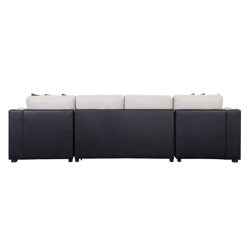 The Merrill sectional sofa provides ample space for snacking, snoozing, and relaxing! Upholstered in a sharp combo of beige fabric and black PU, this substantial U-shape sectional includes not only a pull-out sleeper with full foam mattress, but also a storage chaise. Square accent pillows are included for extra style while you lounge.