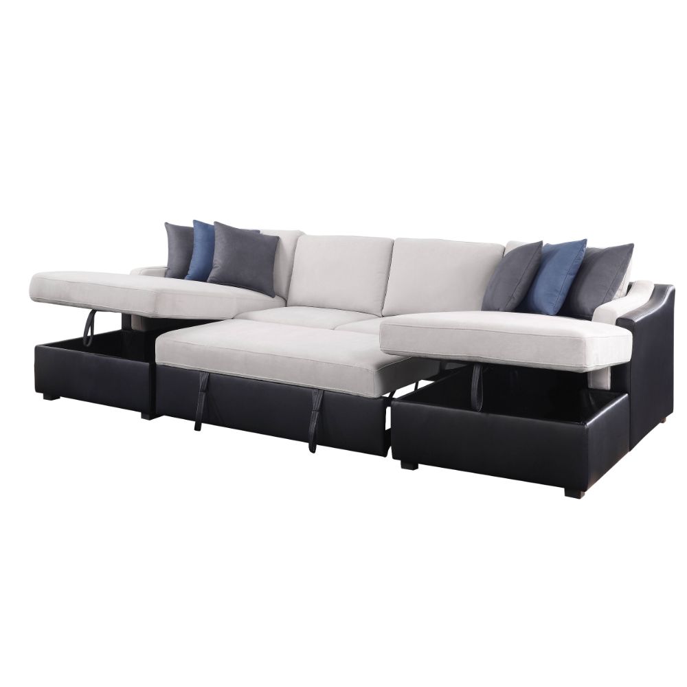KD, Sectional w/Sleeper () Storage: Chaise, 6 Pillows "U" Shape (NOT Reversible) Includes: LF & RF Chaise both w/Storage, Armless Love w/Pull-out Sleeper (Full Foam) Tight Back & Seat Cushion CONSTRUCTION: S-Spring+Full Foam Seat, Inside Frame: Wood (Eucalyptus & Ply), Foam CUSHION: Box Seat Cushion w/Welt (Tight) BACKREST: Tight Cushion ARMREST: Sloped & Side Pillow Top Plastic Block Leg Metal Sleeper Mechanism Material: Fabric & PU (Solid Pattern) 6 Pillows: Square Shapes, Packed 3 w/Chaise (Contrast Pattern, Removable Cover, Size: 19" x 19")