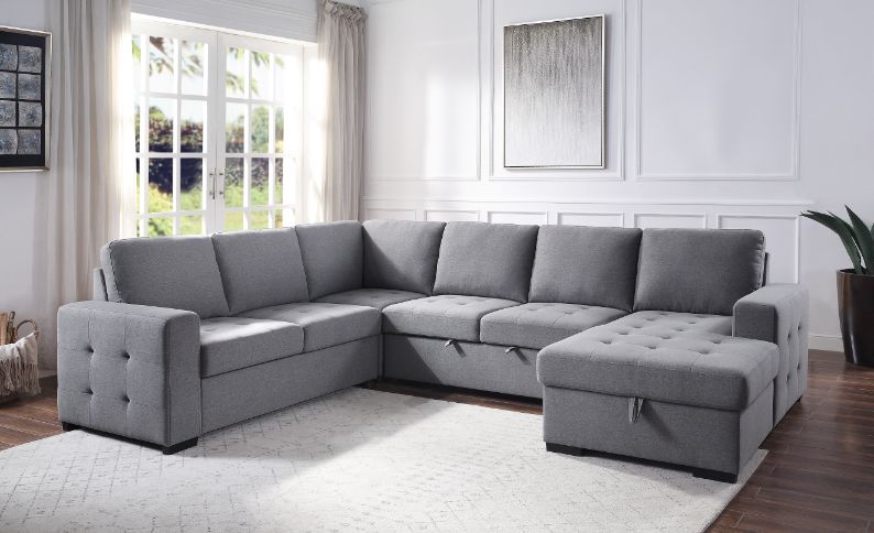 Kick back and relax after a long day at the office on this Nardo storage sleeper sectional sofa. The chaise features highly sought-after storage, ideal for keeping extra blankets and pillows hidden. The loveseat offers a pull-out bed for guests, providing more function to your living room. The tufted details add a touch of sophistication. With its beautiful neutral gray color, it is easy to mix and match aesthetics to match your style.