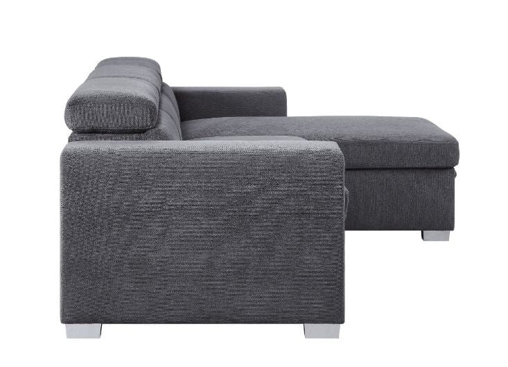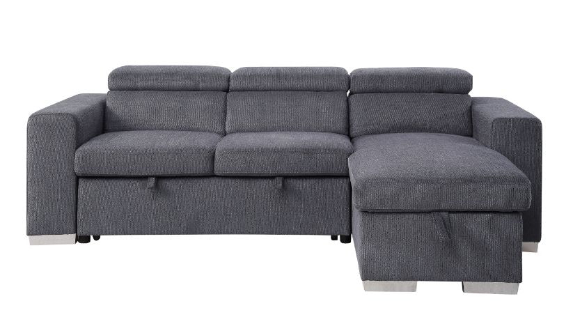 With simple, flexible, and convenient design, the sectional sofa consists of reversible loveseat and chaise, which allow you to configure the living room space for your needs effortlessly. The loveseat with a pull-out bed underneath converts into extra sleeping space when required, while the chaise lifts up to reveal a secret storage area that could keep bedding within reach. Stunning yet functional and comfortable. Full foam cushions in a lush soft gray chenille easily conform to your body, with adjustable headrests for extra comfort.