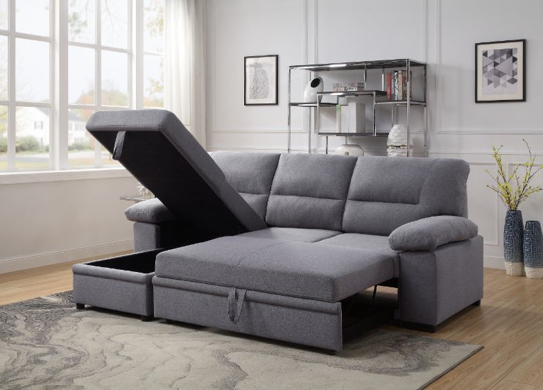 Coming with flexible designs and versatile function, this stunning sectional sofa is comprised of a storage chaise and loveseat with pull-out bed. It's chaise seat lifts up to reveal ample storage for all your clutter. The loveseat section pull out to transform the entire sofa into an spacious sleeping space. Full foam cushions in a gray fabric make the sofa feel very soft and warm, with pillow top armrests for extra comfort. Make smart decor choices with this multifunctional sectional sofa