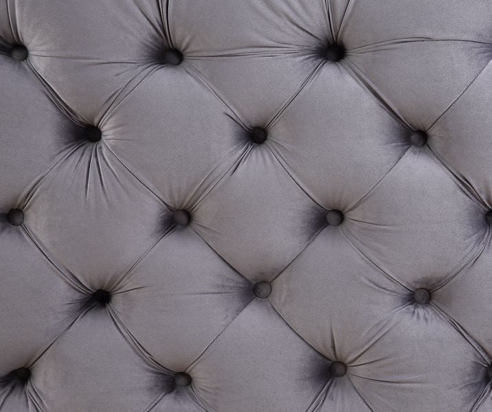 Classic button tufting combined with beautiful upholstery creates a cozy and inviting look that will blend well with any decor. Designed for your comfort and relaxation, the Wugtyx Living Room Collection is fully upholstered in dark grey velvet. It has tight seat and back cushion, and full foam seat construction offers excellent features in durability and comfort. Metal splay legs give the seat elegant support. The attached accent pillows share the same color as the sofa for a cohesive aesthetic. Give your living room an alluring focal point with the Wugtyx Living Room Collection.Finish