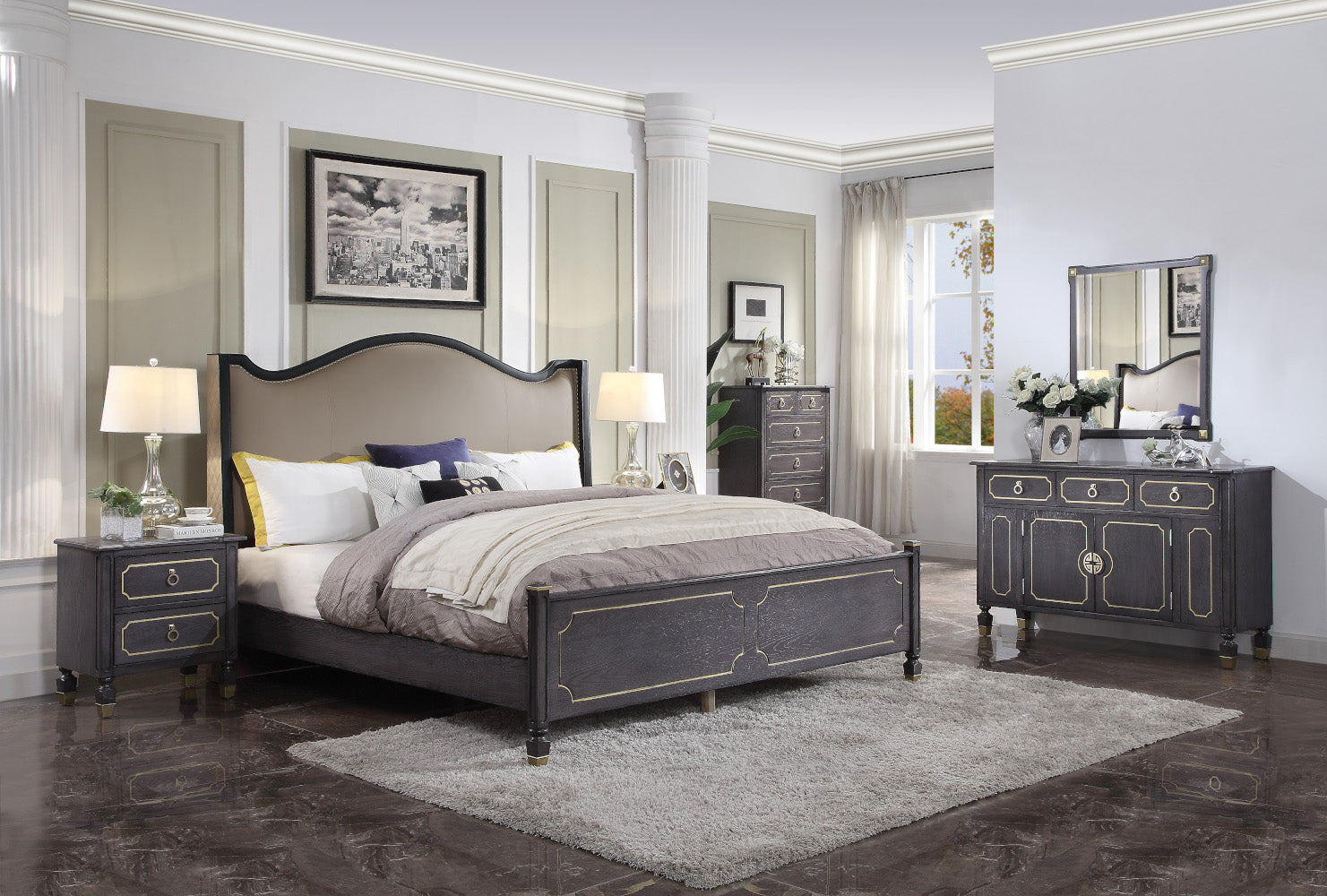 Striking in all dimension, this House Marchese bedroom set will instantly transform the interior to create a statement. Supremely contemporary, the headboard is upholstered with quality faux leather with cohesive features which will pulls the entire design together. Elegant silhouettes, ornamental stitching, and gilded wooden trimming on each exquisitely crafted piece in this collection will create a regal ambiance in your home.