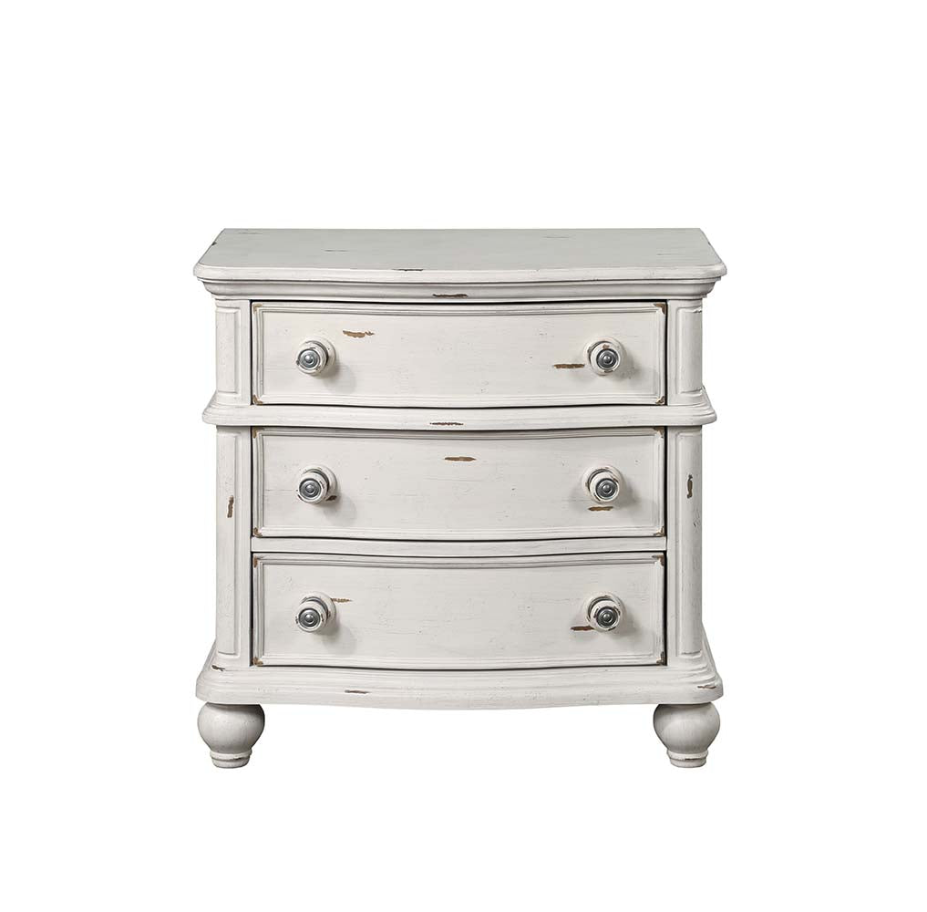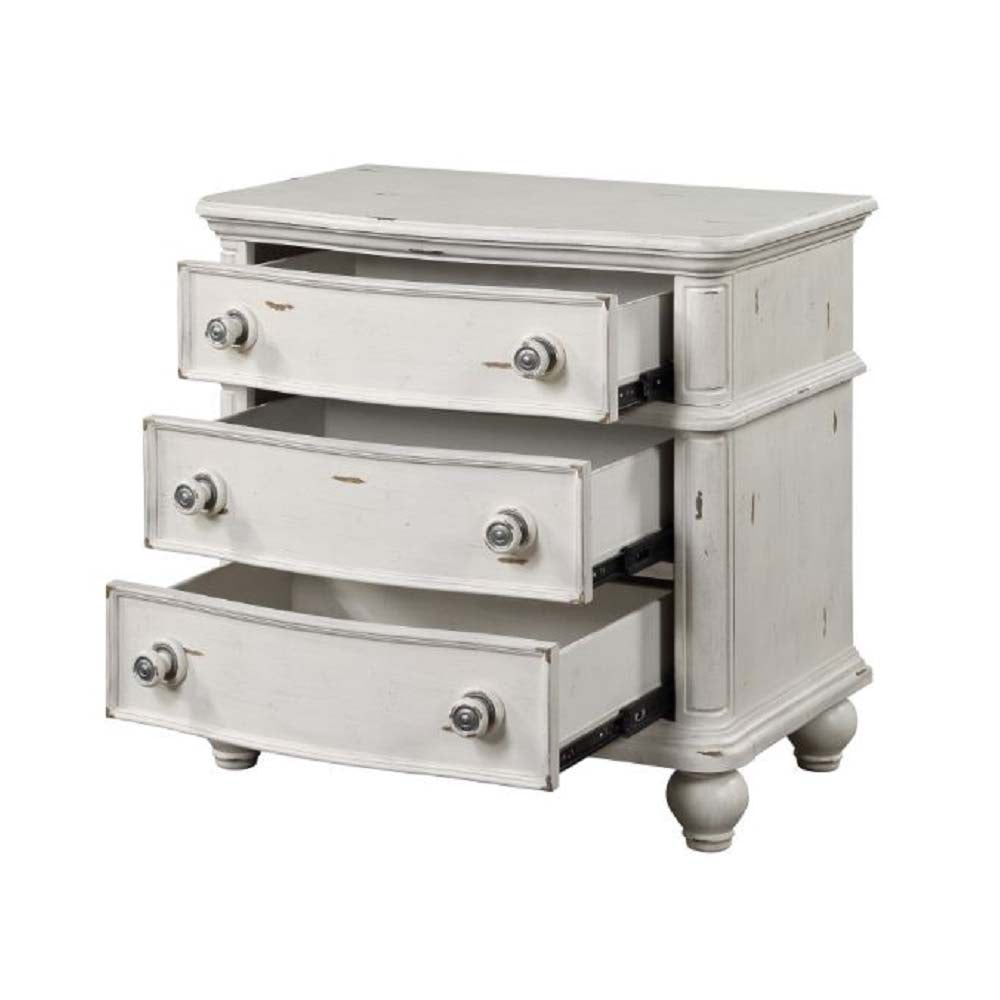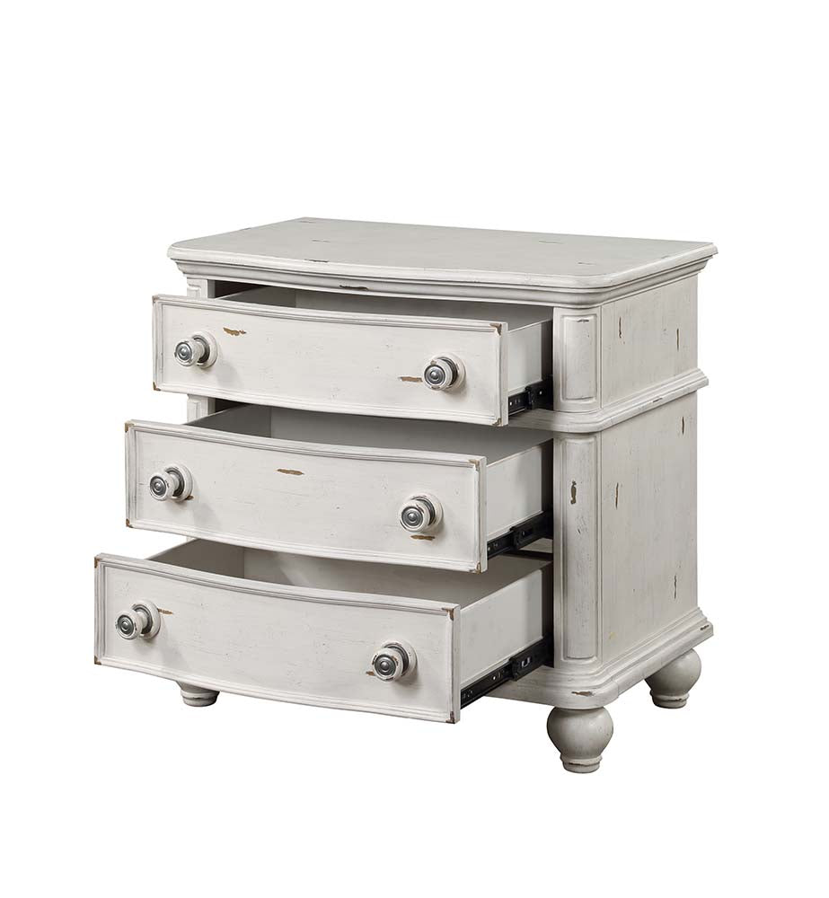 Perfect for cozying up a space, this Jaqueline bed set sets the scene for an inviting bedroom. The bed features a majestic deep button tufted headboard and a low-profile storage footboard. The matching pieces offer plenty of deep storage for all your needs. English dovetail drawer fronts and backs provide strong construction for everyday use. The gorgeous traditional design of this collection showcases a sturdy wooden construction in an antique white finish.