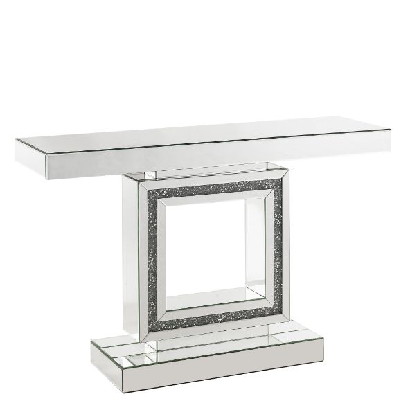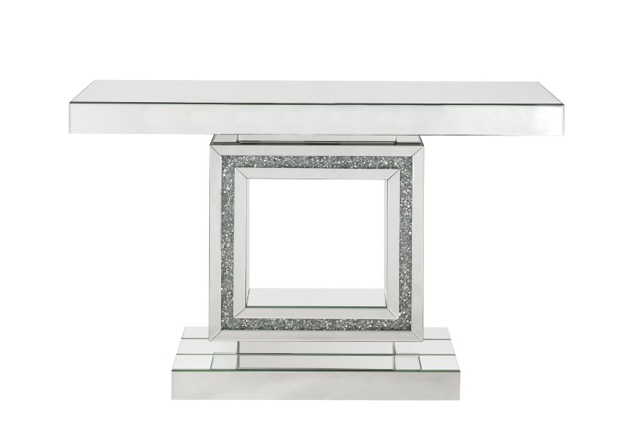 The modern glamour of the Noralie mirrored console table will brighten your foyer or bedroom. This brilliant console table features a mirrored pedestal base with faux diamond inlay, adding dimension, contrast, and shine to this functional piece. It features a sturdy 3mm beveled mirrored top that can be used for display or function. The gleaming console table will reflect the perfect amount of light into any dark space.