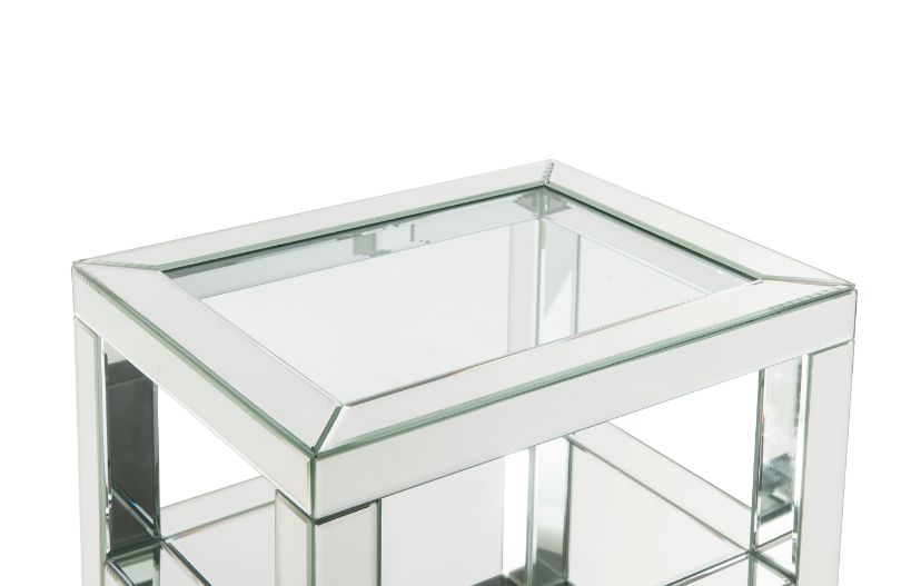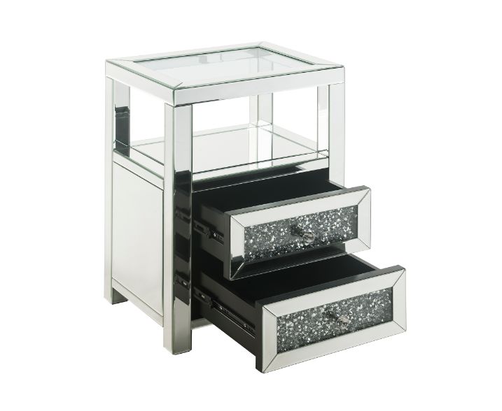The modern glamour of the Noralie Accent Table will brighten your foyer or bedroom. This brilliant accent table features a mirrored finish and a clear tempered glass top, adding dimension, contrast, and shine to this functional piece. It has two drawers with spectacular faux diamond inlays that add the right amount of texture while a tier shelf under the top provides more storage space to suit your needs.
