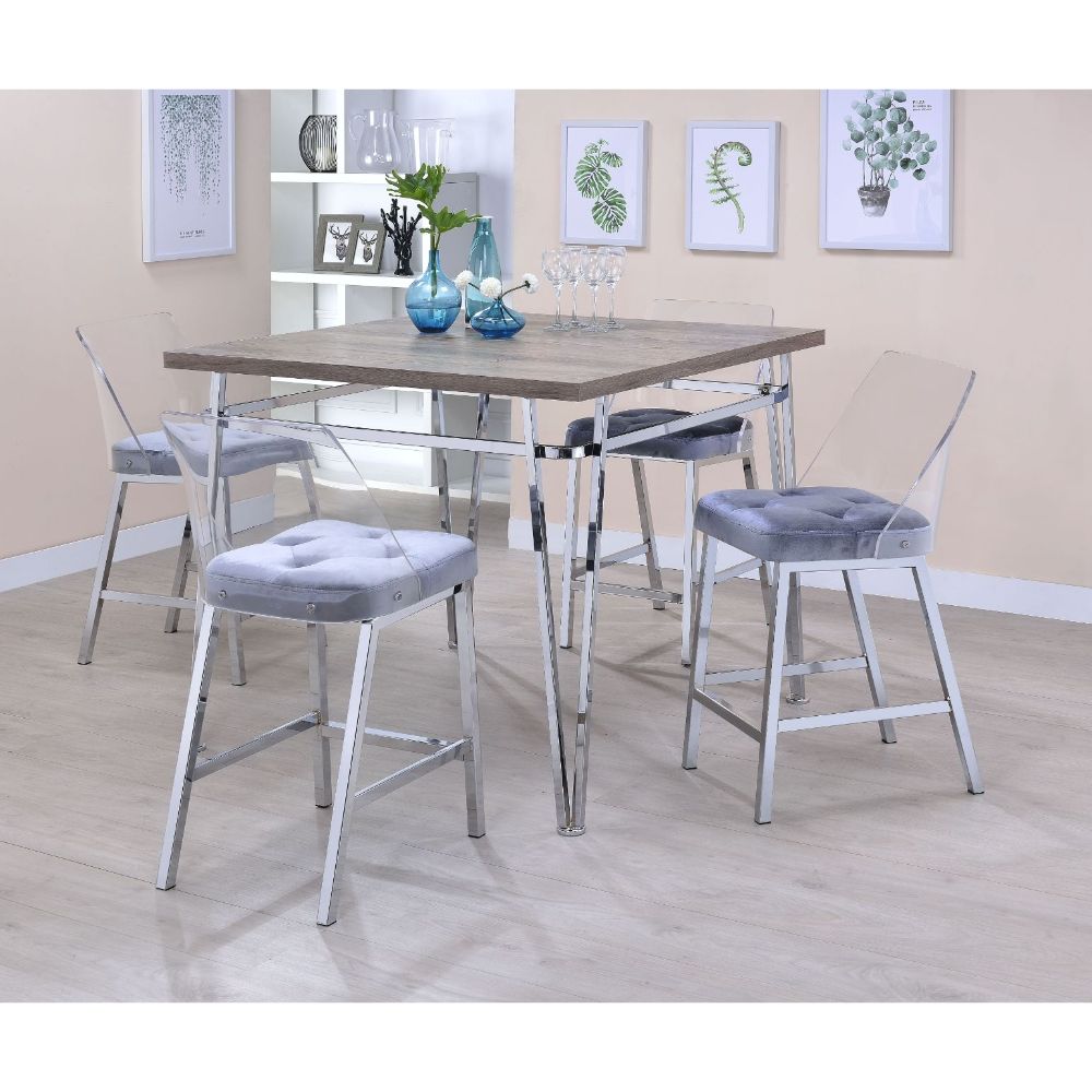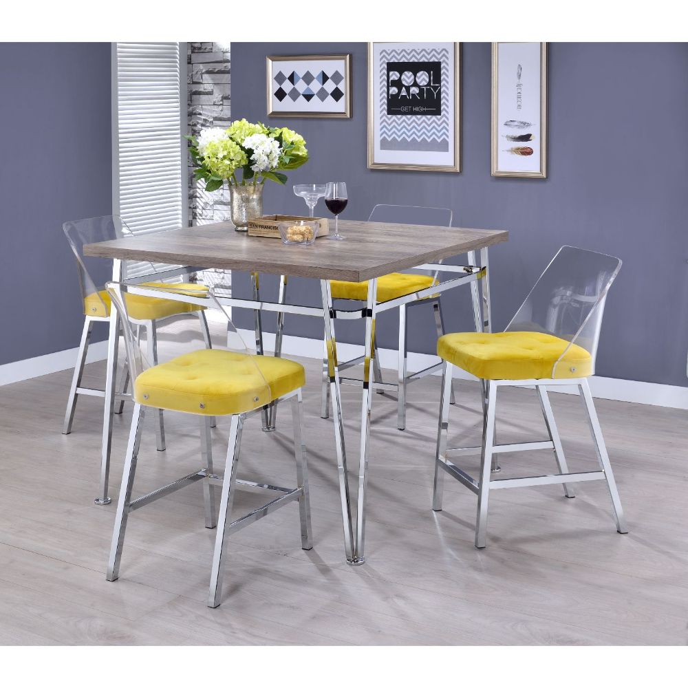 The Nadie II collection has a square counter height table with a contemporary style, merges the beauty of wood and metal to create a casual look. The dining table has a light oak wood veneer top, metal base, and is the perfect table for a small dining room area. Chairs sold separately