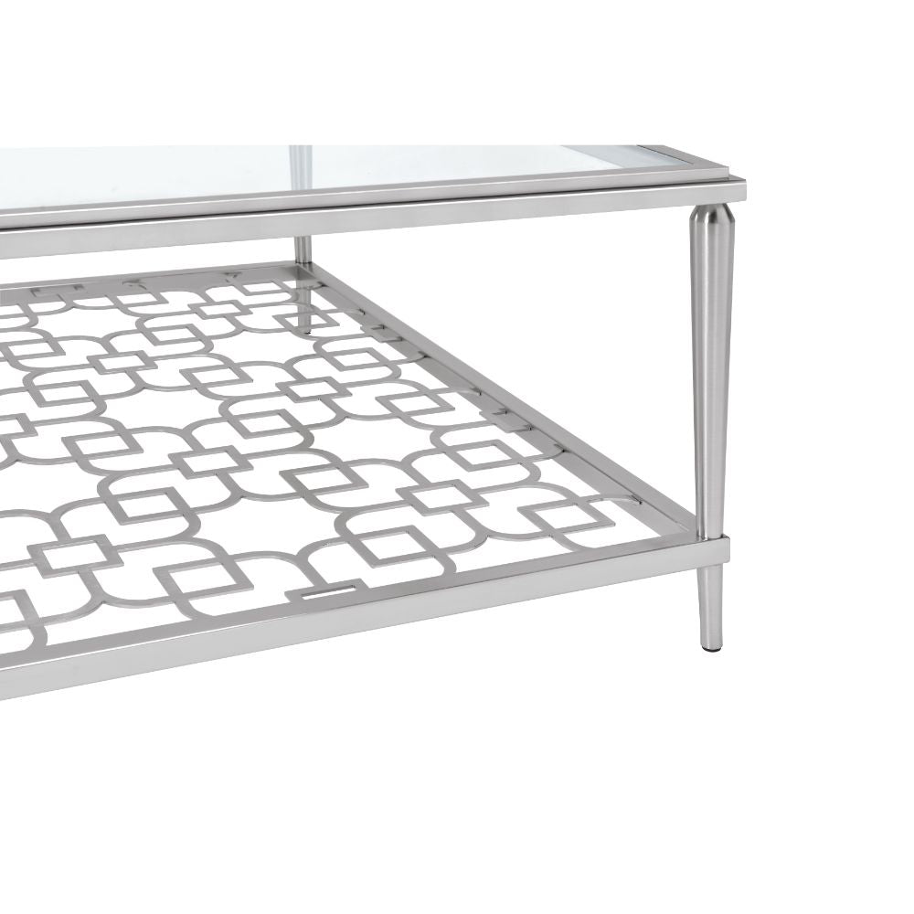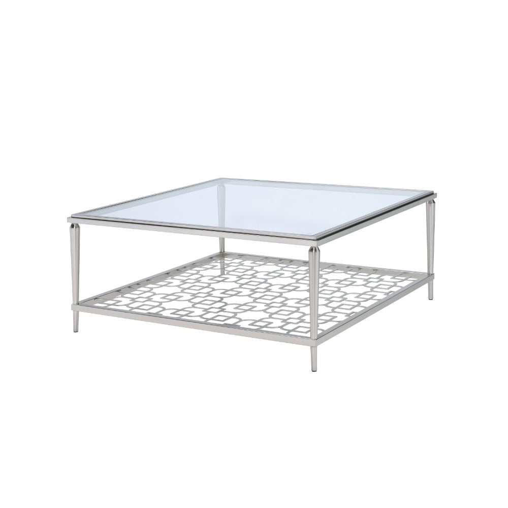 KD, Square Leg Coffee Table Storage: Open Compartment (Bottom Shelf) Glass Top: 8mm Clear Tempered Glass, NOT Beveled (Fixed Top/No Apron) Metal Top Trim & Shelf: Grid Pattern, Powder Coating Metal Tapered Leg: Nickel Finish, Powder Coating Clearance between Floor & Base Support: 3 Inches Height