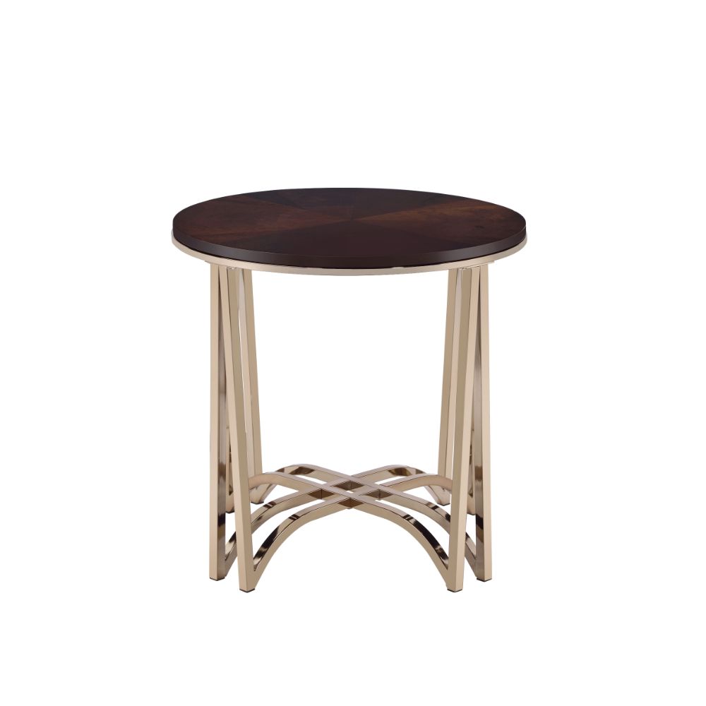 KD, Round Leg End Table NO Storage (Open Base) Round Wood Top: Walnut Finish, Birch Parquet Wood Veneer, PB 18mm (Fixed Top/NO Apron) Metal Leg & "X" Crossbar Support Frame: Champagne Finish, Metal Tube (13/26mm, 20/20mm)