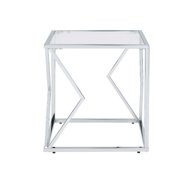Full of sleek, visually-appealing lines, the end table exudes a clean and open design. Sturdy metal frame features ultra-clean lines and a contemporary aesthetic, with a chrome finish enhancing the metallic textures. Clear glass table top allows light to filter into and through the whole table, making it an irreplaceable centerpiece to brighten your living room.
