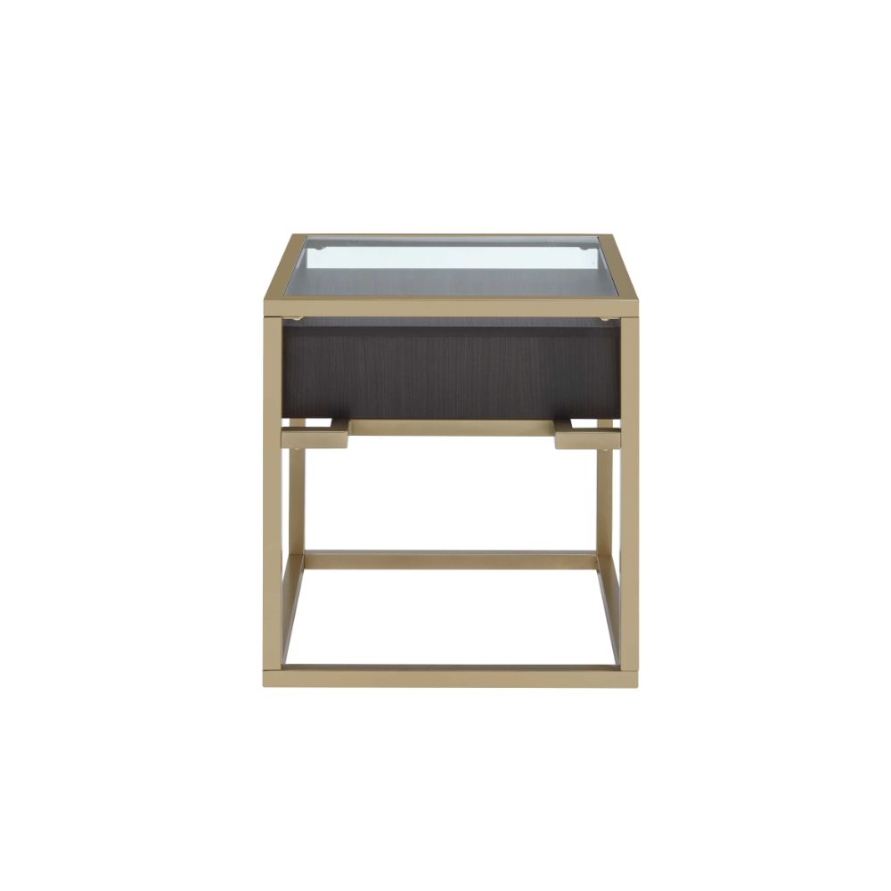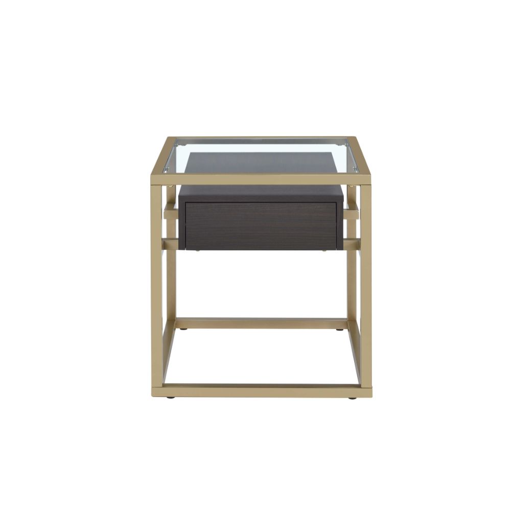KD, Square End Table Glass Top & Metal Frame (Open Base) Storage: 1 Wooden Drw (Front) CONSTRUCTION Glass Top: 8mm Clear Tempered Glass (NO Beveled) Wooden Drawer: Espresso Finish, Paper Veneer with MDF (15mm Thick) Metal Cube Base: Gold Finish (Powder Coating), Metal Square Tube 1" x 1" (25 x 25mm) Drawer: KD, GLIDE Side Metal, DOVETAIL Not Included, Fully Finished Inside, Manual Close, Hardware: Not Included (No Handle nor Knob)